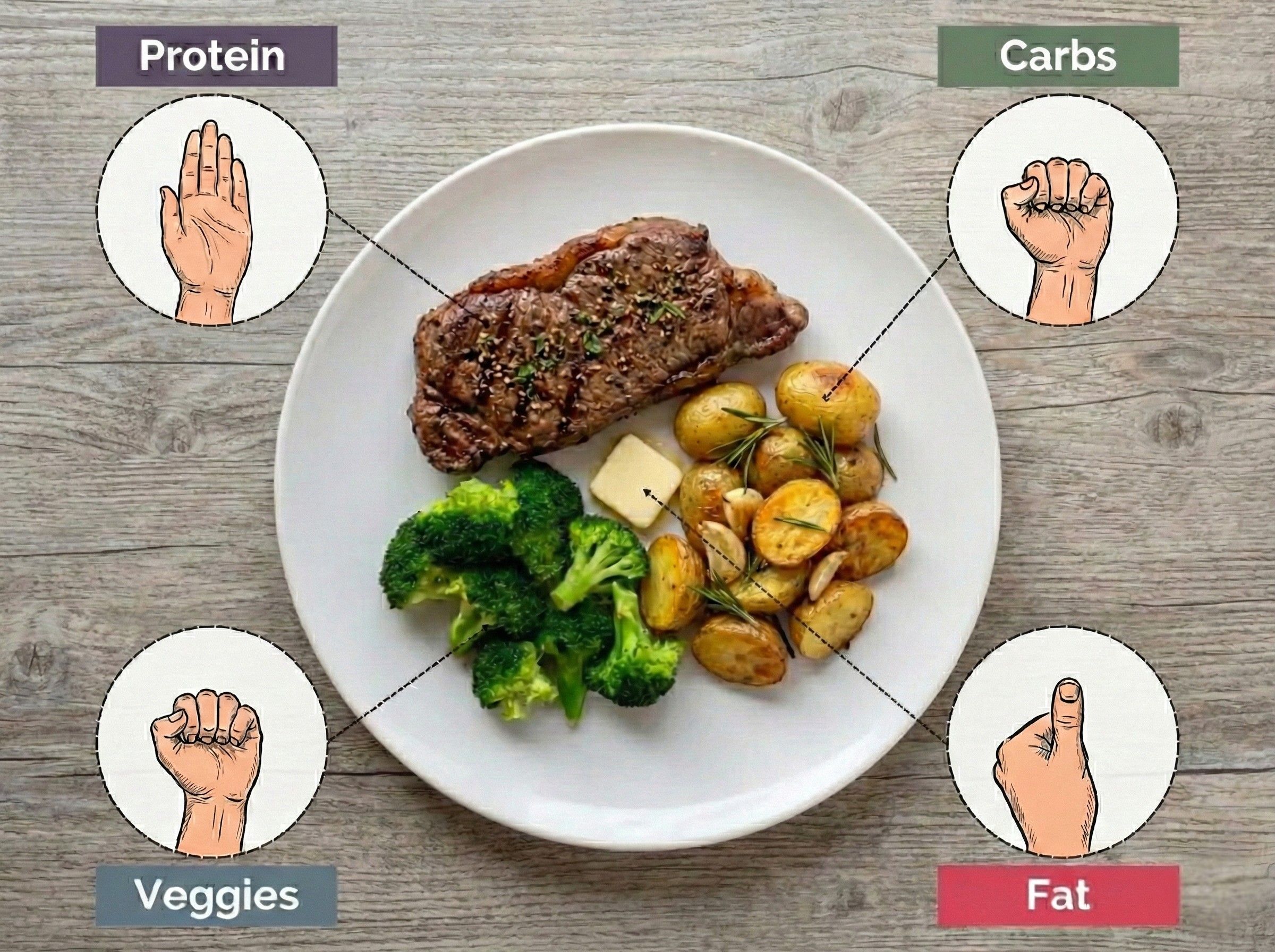 A palm-sized protein, a fist of carbs or veggies, and a thumb of fats can keep tracking consistent even when life is not perfectly planned.